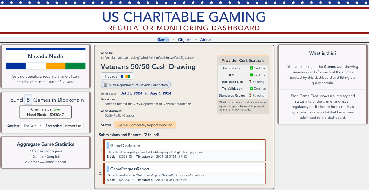 Developed in collaboration with GLI, our RMD serves as an oracle of truth for regulators as demonstrated here: http://nevada.gbcnodes.net/ which will soon be recording live VFW raffles active in the Nevada market.